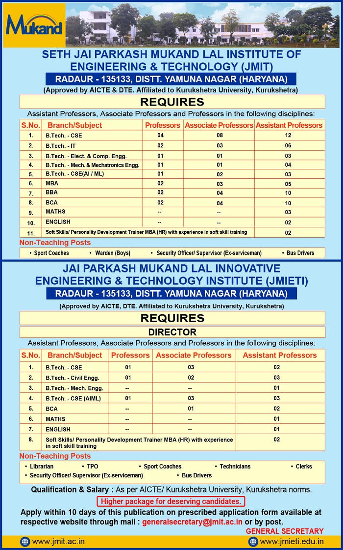 Apply on prescribed Application Form through post or Email- generalsecretary@jmit.ac.in